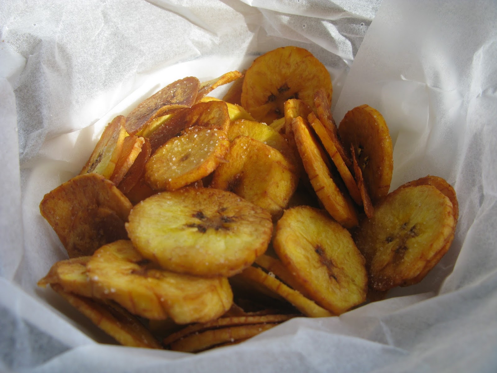 Descasque os plátanos e corte-os a mais fino que puder. Quanto mais fino cortar o plátano, mais estaladiço vai ficar. Aqueça bem o óleo numa fritadeira. A quantidade é mais ou menos a mesma que utiliza para fritar batatas. Coloque as fatias de plátano cuidadosamente no óleo para que não fiquem coladas. Deixe fritar até ficarem coradas. Retire do óleo, escorra em papel absorvente e polvilhe com sal fino.